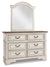 Elevating the art of traditional cottage styling, this bedroom set is your dream retreat realized. A sumptuous beauty, the upholstered bed wows with a distressed chipped white finish for heirloom appeal. Deep tufting on the cushioned upholstered headboard adds such a cozy element sure to put you at ease. Framed drawer fronts, decorative corbels, bail pulls and contrasting wood finished surfaces only add to the charm.