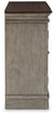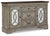 Serve up a sense of traditional cottage design with this dining room server. It features a pair of cabinet doors with inset mirrored glass and decorative fretwork. The server's three smooth-gliding drawers with dovetail construction and black felt bottoms are perfect for storing more delicate items. An antiqued gray body and rich deep walnut brown top, along with bail pulls and knobs finished in a dark bronze tone, complete the beautiful design.