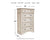 Elevating the art of traditional cottage styling, this bedroom package is your dream bedroom retreat realized. The bed's ornately shaped headboard with inset upholstered cushion brings cozy charm. The dresser and chest feature an antiqued two-tone aesthetic, blending a chipped white with a distressed wood finished top for added appeal. Framed drawer fronts and decorative corbels add refinement, while bail pulls in a dark bronze-tone finish lend a classic touch.
