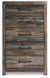 This full-size bookcase bed with storage, dresser, mirror, chest of drawers and two nightstands is a refined take on barn board beauty. Its complex, replicated wood grain showcases hints of burnt orange and teal tones for a sense of weatherworn authenticity. Three open cubbies lined with a dimming LED light strip keep bedtime reads top of mind while underneath the bed is four smooth-gliding drawers and four open cubbies that accommodate casually cool storage bins. The dresser, chest and nightstand with smooth-gliding drawers lined with faux linen laminate and industrial dark-tone hardware complete this rustic and industrial style bedroom. Mattress and foundation/box spring available, sold separately.