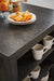 Perfect portion. Striking a simply chic pose, this counter height dining room table set serves up high style on a smaller scale. Its antiqued gray wash finish gives the clean-lined design a casually cool sensibility. Ideally sized for dinner for two or as an impromptu workspace, side shelves cleverly balance form and function. Covered in a textured gray fabric, the stool’s cushioned seat goes easy on the body.